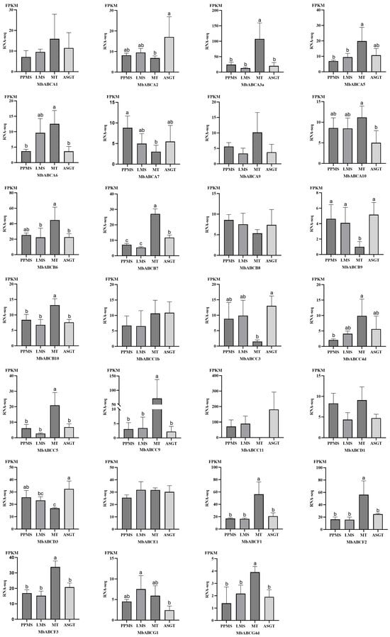 Tissue-specific differential expression of MbABC proteins. Data represent the means ± SE. “a, b, c”, p < 0.05.