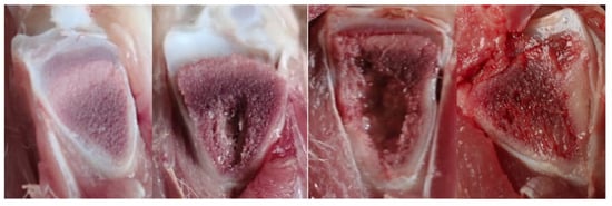 The sample size was 200 ducks aged 35 to 37 post-hatching days from four commercial farms (50 birds/farm). Specifically, three farms had birds at 35 days of age, and one farm had birds at 37 days of age. The birds were randomly taken, and their body weights were measured in groups of 10 birds. Then, they were necropsied one by one to examine the gross lesions of the proximal tibia and femoral head in the leg bones. The lesions were scored according to their severity level following the BCO lameness lesion classification presented in Figure 3 [31,32].