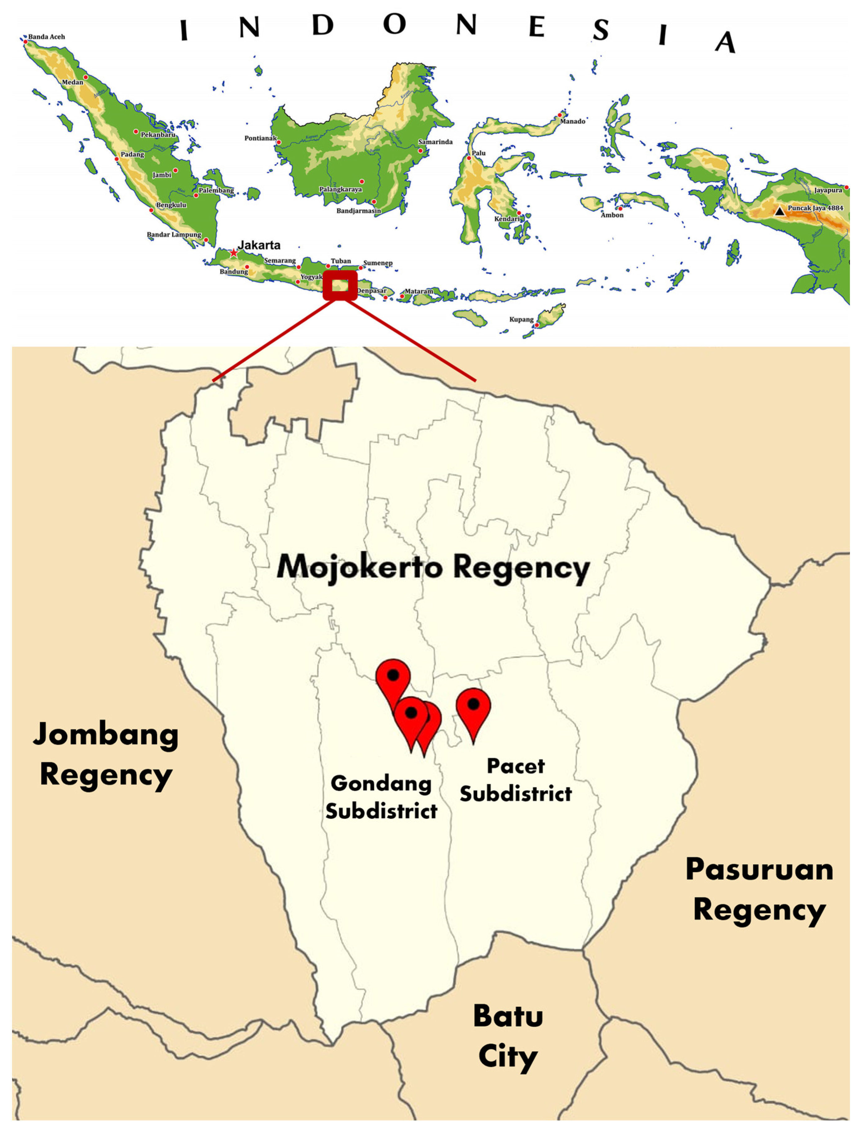 Map of four survey sites of BCO lameness in commercial duck farms in Mojokerto, East Java, Indonesia. The red dots indicate four locations of the survey sites.