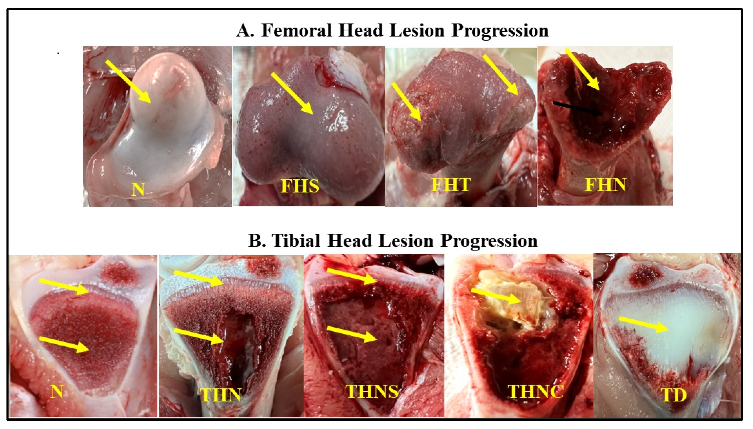 Categorization of femoral (A) and tibial (B) lesion progressions. Yellow arrows represent the differences in the lesion severity in each category. N = Femur head and proximal tibia appear entirely normal; FHS = Proximal femoral head separation (epiphyseolysis); FHT = Proximal femoral head transitional degeneration; FHN = Proximal femoral head necrosis; THN = Proximal tibial head necrosis; THNC = Proximal tibial head necrosis caseous; THNS = Proximal tibial head necrosis severe TD = Tibial dyschondroplasia.