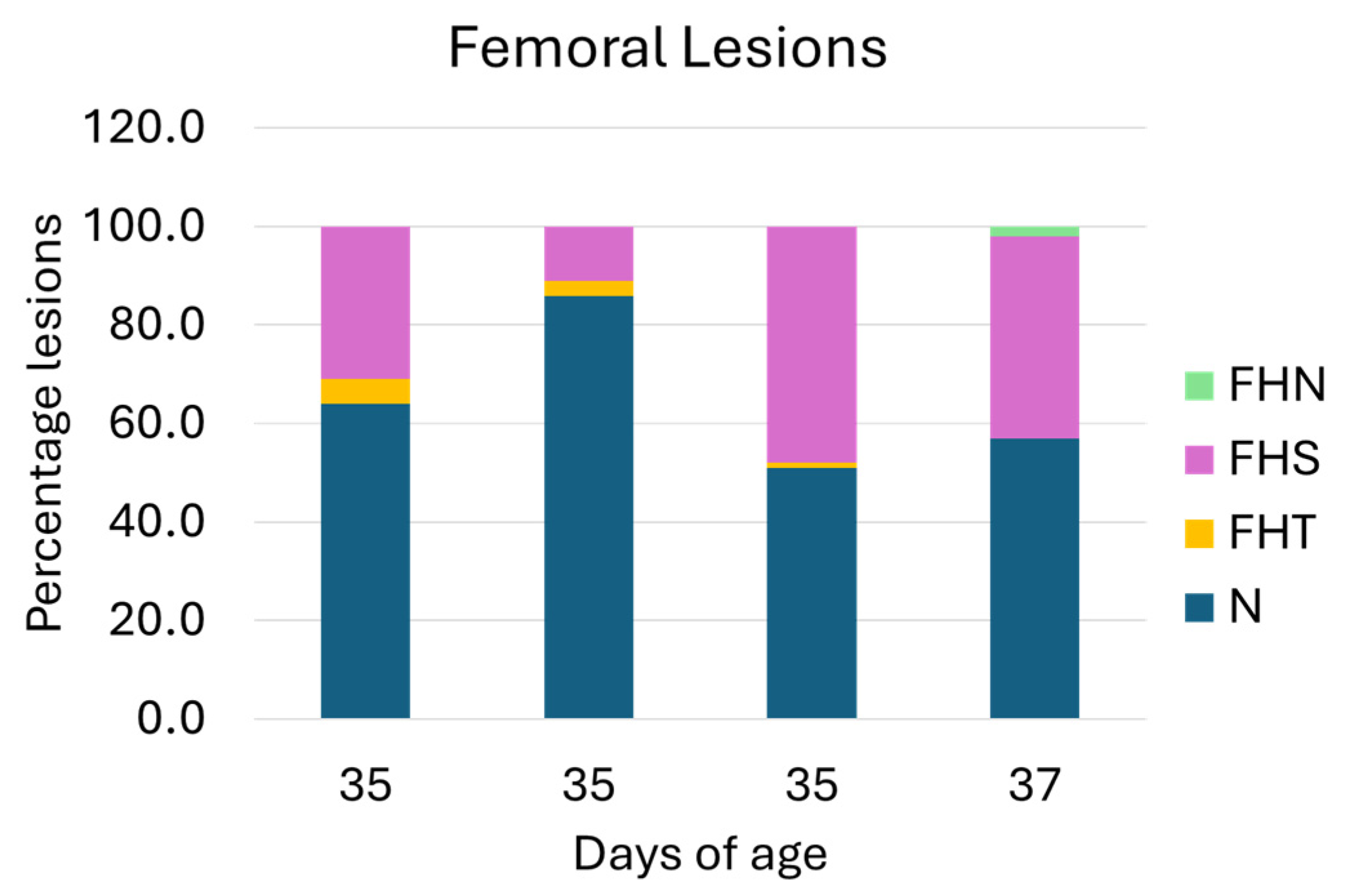 Percentage of femoral lesion categories. N = normal femoral head; FHS = proximal femoral head separation; FHT = proximal femoral head transitional degeneration; and FHN = proximal femoral head necrosis. Of the four flocks, N and FHS demonstrated the highest and the second-highest lesion categories.