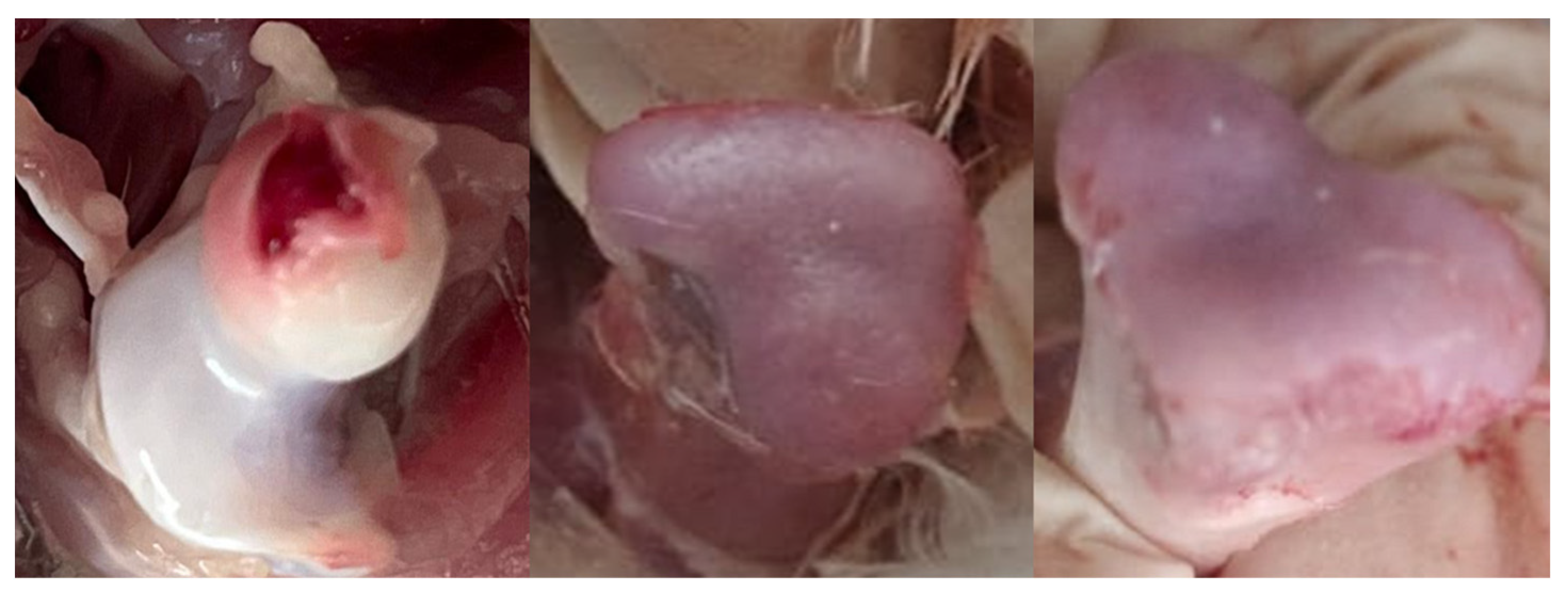 The identified lesions in the proximal femur and tibia from necropsied ducks were calculated and are reported as simple frequency statistics. A one-way analysis of variance (One-way ANOVA) was used to analyze the live body weight data using JMP Pro 18 (SAS Institute, Cary, NC, USA). Statistical significance was determined at p < 0.05.