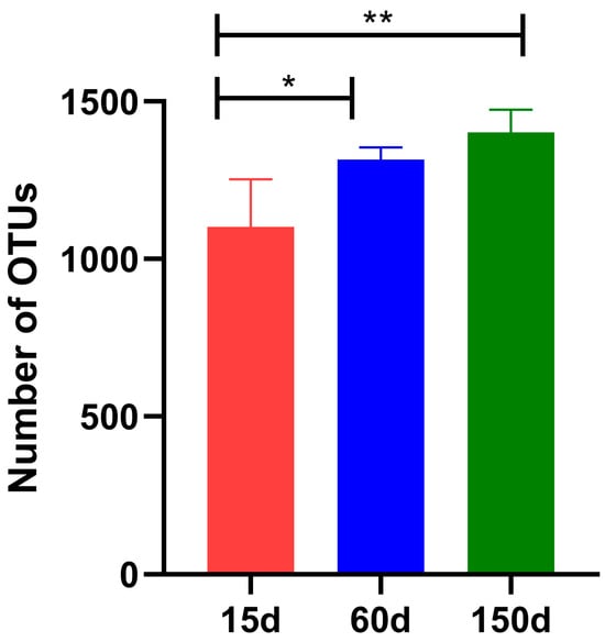 Comparison of Operational Taxonomic Units (OTUs) richness in air samples across different growth stages (n = 5 farms × 5 sampling points). OTU counts were lowest at 15 days, increased significantly at 60 days, and further elevated at 150 days (* p < 0.05; ** p < 0.01).
