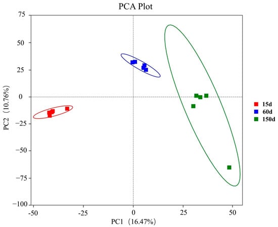 Principal Coordinates Analysis (PCA) of bacterial community β-diversity across the three growth stages based on Bray–Curtis dissimilarity (n = 5 farms × 5 sampling points).