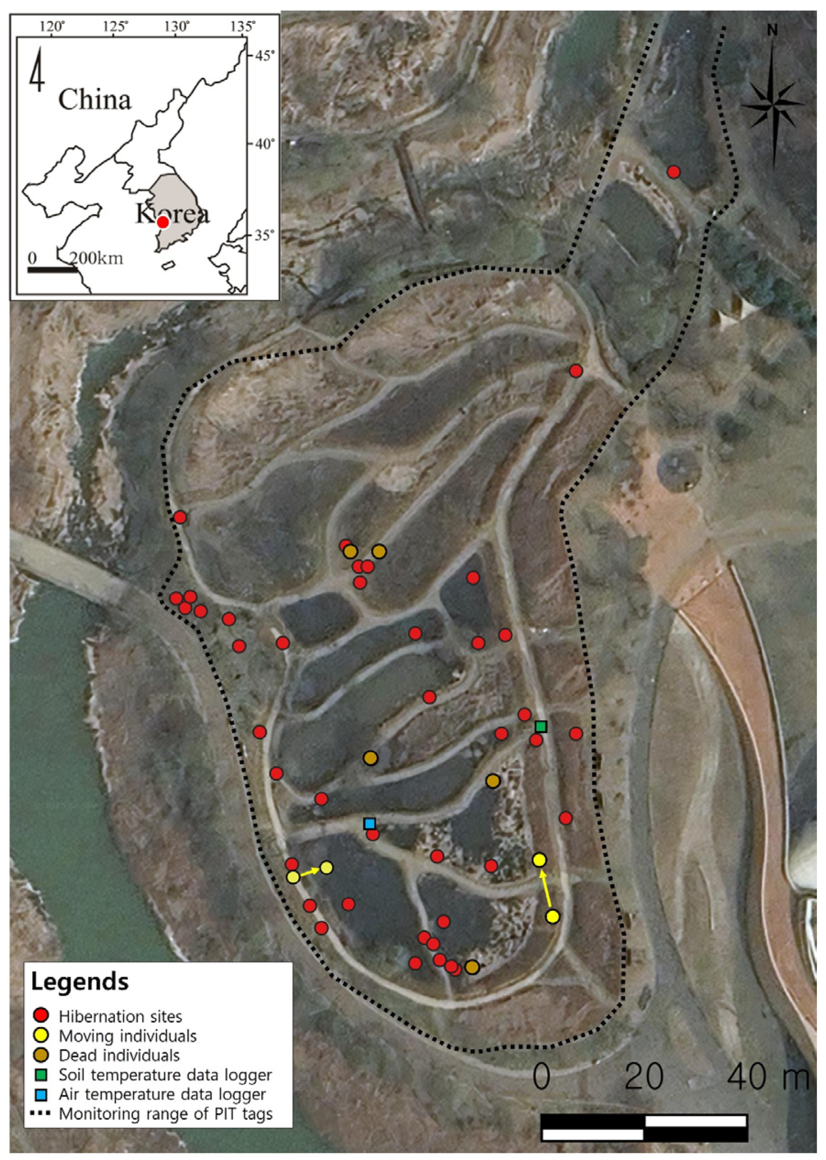 - Lee, J.H.; Lee, H.J.; Ra, N.Y.; Kim, J.K.; Eom, J.H.; Park, D.S. Application of PIT tag and radio telemetry research methods for the effective management of reptiles in Korea National Parks. Kor. J. Environ. Biol. 2009, 27, 146–154. [Google Scholar]