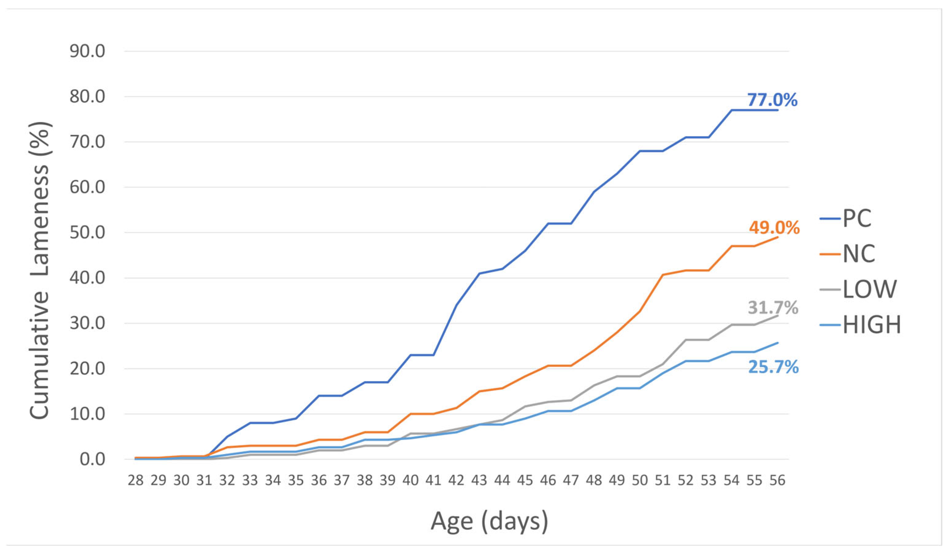 - Alharbi, K.; Dang Trieu Do, A.; Alqahtani, A.; Perera, R.; Thomas, A.; Meuter, A.; Alrubaye, A.A.K. Assessing the Impact of Spraying an E. faecium Probiotic at Hatch and Supplementing Feed with a Triple-Strain Bacillus-Based Additive on BCO Lameness Incidence in Broiler Chickens. Animals 2025, 15, 1765. [Google Scholar] [CrossRef]