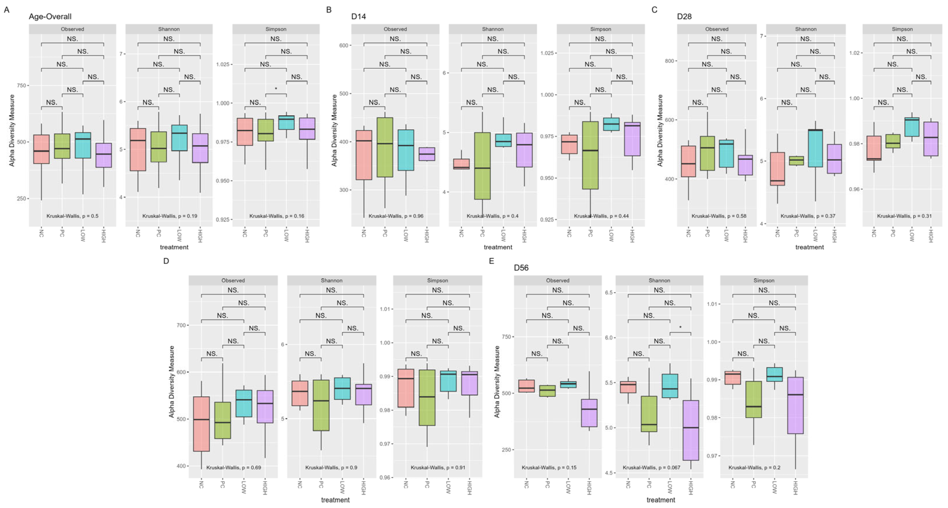 - Novoa Rama, E.; Bailey, M.; Kumar, S.; Leone, C.; den Bakker, H.C.; Thippareddi, H.; Singh, M. Characterizing the gut microbiome of broilers raised under conventional and no antibiotics ever practices. Poult. Sci. 2023, 102, 102832. [Google Scholar] [CrossRef]