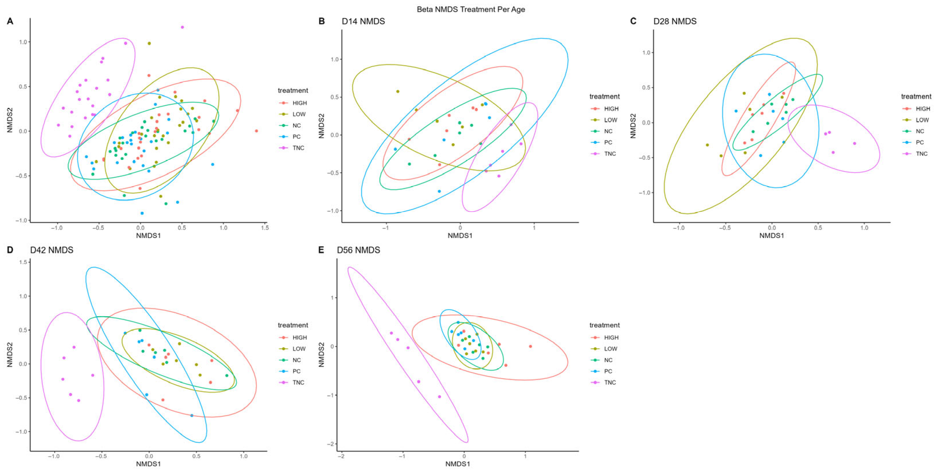| Probiotic Spray—LOW | E. faecium 669 @ 2 × 109 CFU/bird on d0 | Litter |