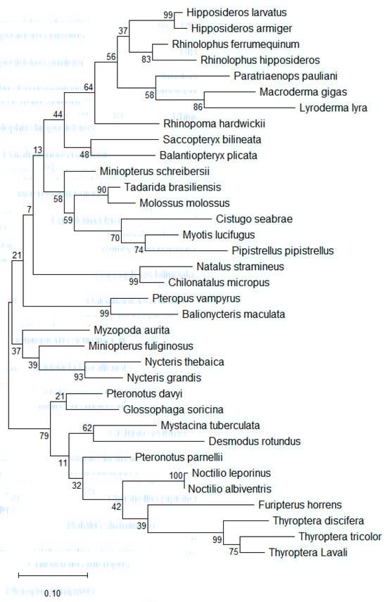 Phylogenetic tree for 35 representative bat species in 20 families. Evolutionary relationships were inferred using the Maximum Likelihood method based on nucleotide substitutions, and the tree with the highest log likelihood is shown [45]. The bat species depicted correspond to those listed in Table 2 and illustrated in Figure 1. The phylogenetic analysis reveals substantial genetic diversity among all bat species, with Noctilio leporinus and Noctilio albiventris differing by a single nucleotide and exhibiting the highest sequence similarity (100%) in this dataset.