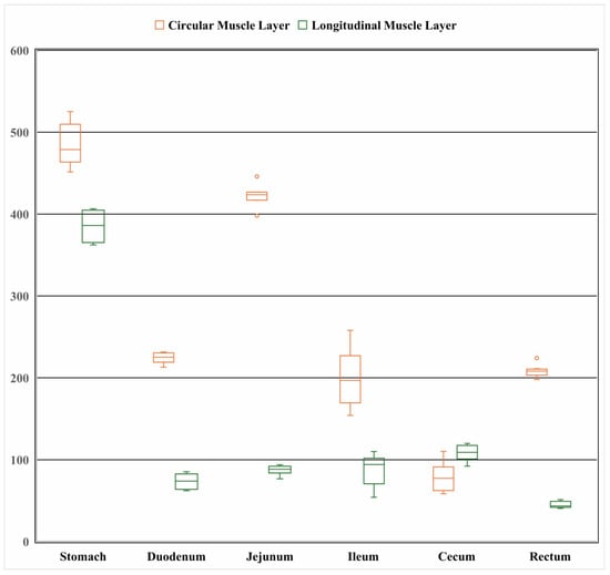 As shown in Figure 3, the gastric circular muscle was the thickest (484.29 ± 25.05 μm), approximately 6.1 times thicker than that of the cecum (79.04 ± 17.00 μm). Among the small intestine segments, the jejunal circular muscle was the thickest (422.40 ± 14.02 μm), while the circular muscle of the large intestine was relatively thin (79.04 ± 17.00 μm). In terms of the longitudinal muscle layer, the stomach had the thickest longitudinal muscle (385.08 ± 16.69 μm), approximately 8.6 times thicker than that of the rectum (44.90 ± 3.78 μm). The longitudinal muscle thickness of the small intestine segments was similar (jejunum = ileum > duodenum), and the cecum had a relatively thicker longitudinal muscle layer. Overall, the thickest structure among the measured muscle layers was the gastric circular muscle layer (484.3 μm), while the thinnest was the rectal longitudinal muscle layer (44.8 μm). (Note: Autolysis of the small intestinal mucosa (Figure 2A–C) was observed, rendering mucosal thickness measurements unreliable; thus, mucosal layer data are not presented herein.)
