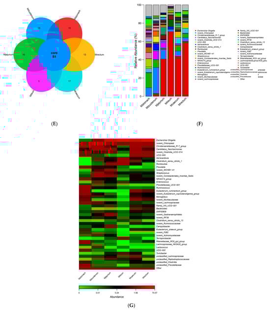 Gastrointestinal bacterial diversity. (A) Alpha index dilution curve. (B) Shannon index dilution curve. (C) PCoA: principal coordinate analysis. (D) Collinearity relationship diagram. (E) Venn diagram of species distribution among samples. (F) Relative abundance bar chart of dominant species. (G) Abundance Heatmap.
