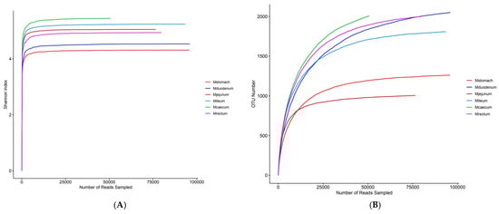 Paired-end reads from sequencing were initially merged based on overlap, followed by demultiplexing and quality filtering using default parameters. Subsequent analysis included Operational Taxonomic Unit (OTU) clustering, alternatively Amplicon Sequence Variant (ASV) denoising, and taxonomic classification. Diversity indices (α-diversity) were calculated from the OTU/ASV tables after rarefaction. β-diversity was assessed based on Bray–Curtis distances, and Principal Coordinate Analysis (PCoA) was performed to visualize community dissimilarities among gastrointestinal segments. All statistical analyses and visualizations were conducted in R (v3.6.0) utilizing the vegan (v3.1.1) and ggplot2 (v2.5-6) packages. Taxonomic assignment was performed against the SILVA database (v138) for 16S data and the UNITE database for fungal data using a Naïve Bayesian classifier with K-mer-based alignment (k = 8) [20].