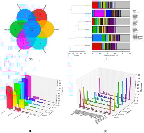 A total of 258 OTUs were shared by the stomach and other intestinal segments. Every segment had distinct fungal genera, with the rectum having the most unique genera (73), which make up 22% of the rectum’s total OTUs. The ileum came next, with 66 distinct OTUs, or 20% of the total (Figure 5C). The species composition of the stomach and different intestine segments, as well as the intestinal segments themselves, varied significantly. However, the cecum and ileum, as well as the stomach and jejunum, exhibited relatively high species similarity (Figure 5D).
