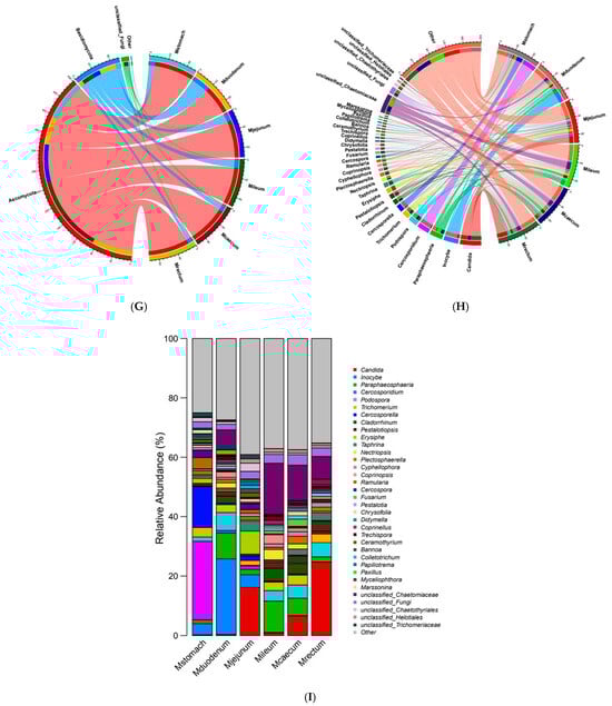 At the genus level, Chaetomiaceae (a family-level taxon) and Paraphaeosphaeria were the most dominant genera, while the species Candida albicans also exhibited high abundance. Candida albicans and Chaetomiaceae belong to the Ascomycota phylum, and Paraphaeosphaeria also falls under the Ascomycota phylum (Figure 5H). Unclassified-Chaetomiaceae is primarily distributed in the duodenum, jejunum, ileum, and rectum. Paraphaeosphaeria is primarily distributed in the duodenum, ileum, and cecum (Supplementary Figure S2H). Candida is the dominant genus in the jejunum, cecum, and rectum, while Inocybe (25.41%) is the dominant genus in the duodenum and is present in small quantities in the stomach (3.77%) and jejunum (4.28%) (Figure 5F). Cercosporidium (26.4%) and Cercosporella (13.76%) were the dominant genera in the stomach, Erysiphe (7.77%) is more prevalent in the jejunum, and is only present in the stomach (1.62%) (Figure 5I).