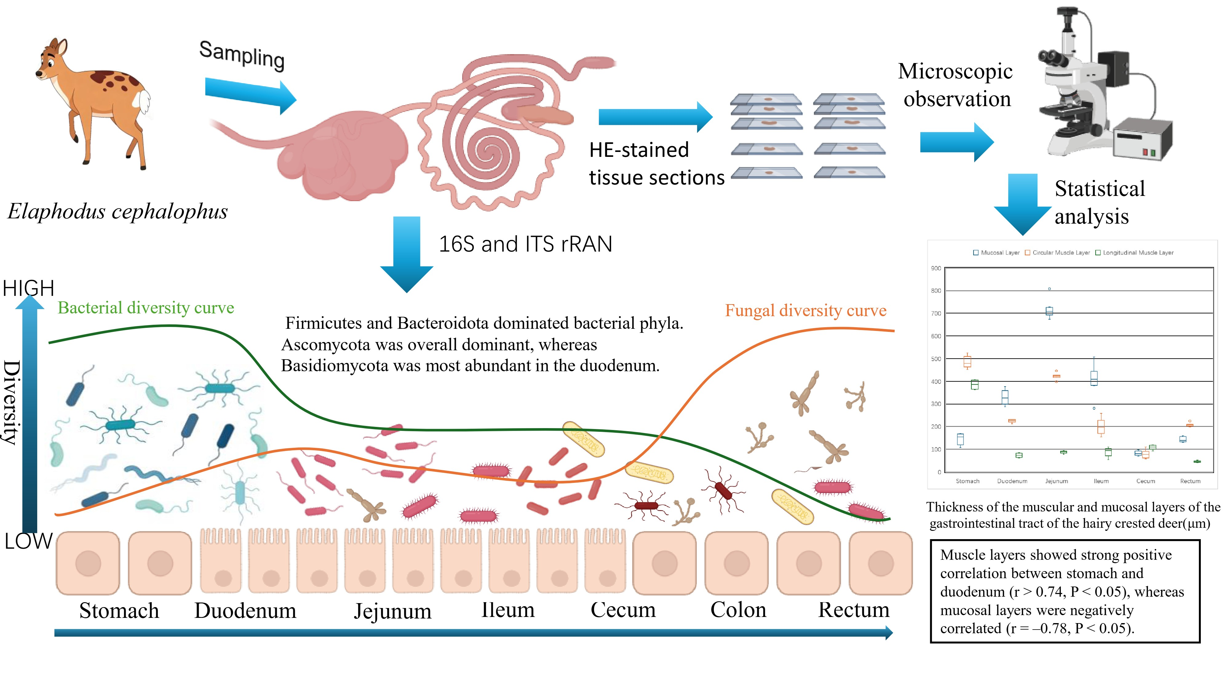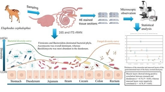 Chen, S.; Dai, H.; Feng, Z.; Zhu, H.; Zhang, J.; Fang, T.; Yuan, S.; Wu, B. Gut Morphological Structure-Microbial Characteristics in Elaphodus cephalophus: A Case Report. Animals 2025, 15, 3651. https://doi.org/10.3390/ani15243651