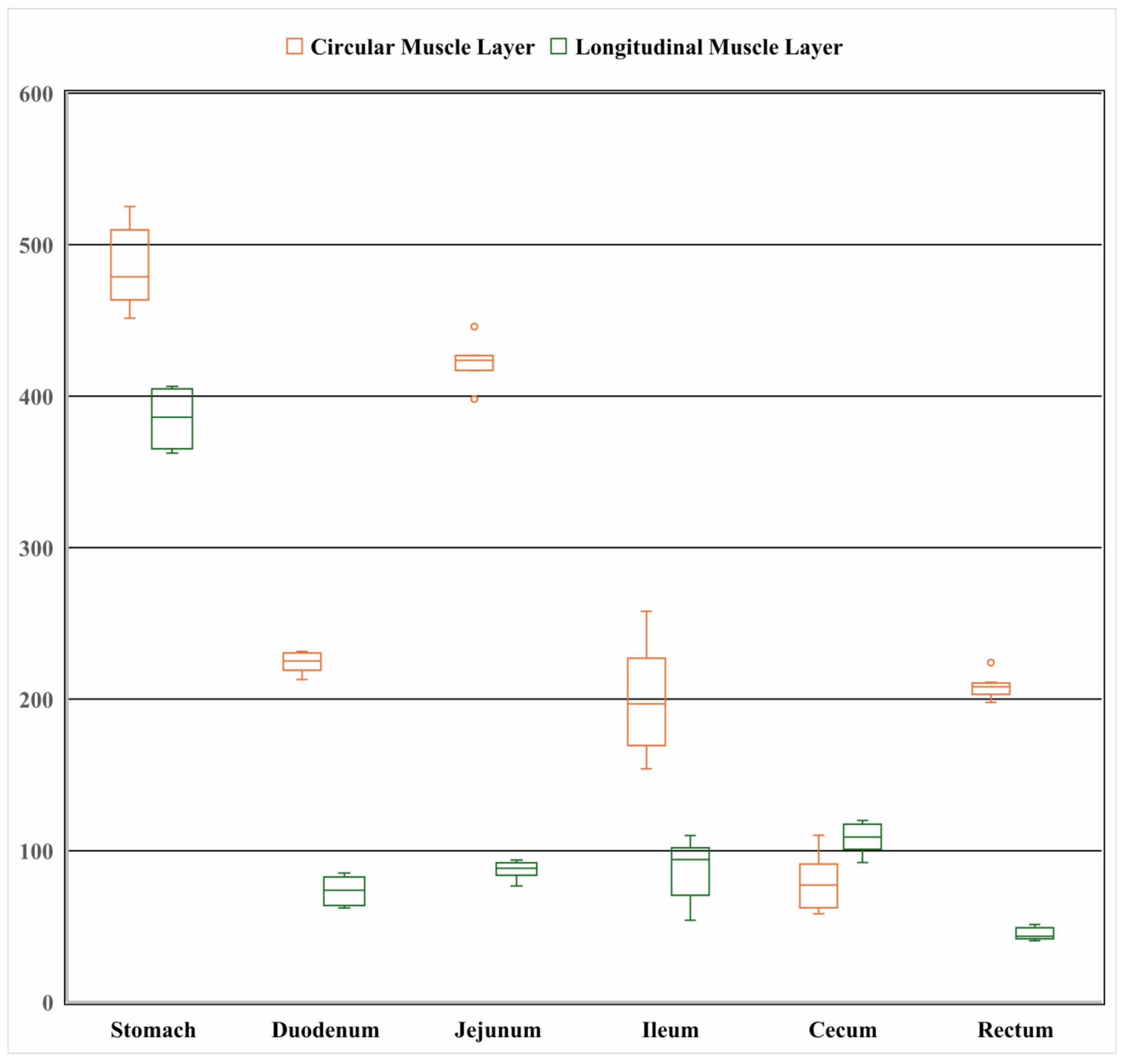 3.1.2. The Thickness of the Circular and Longitudinal Muscle Layers of the Gastrointestinal Tract in the Elaphodus cephalophus