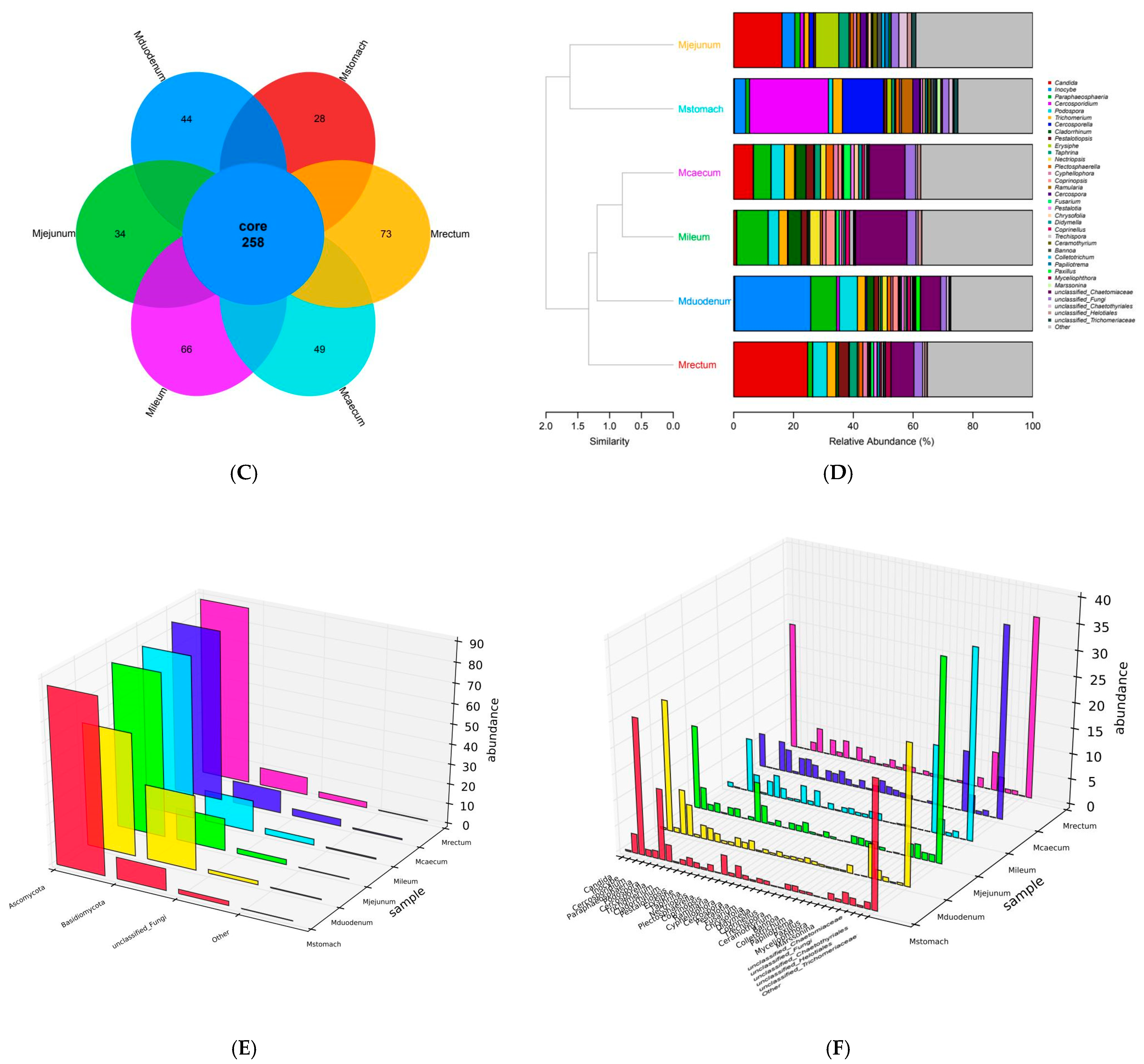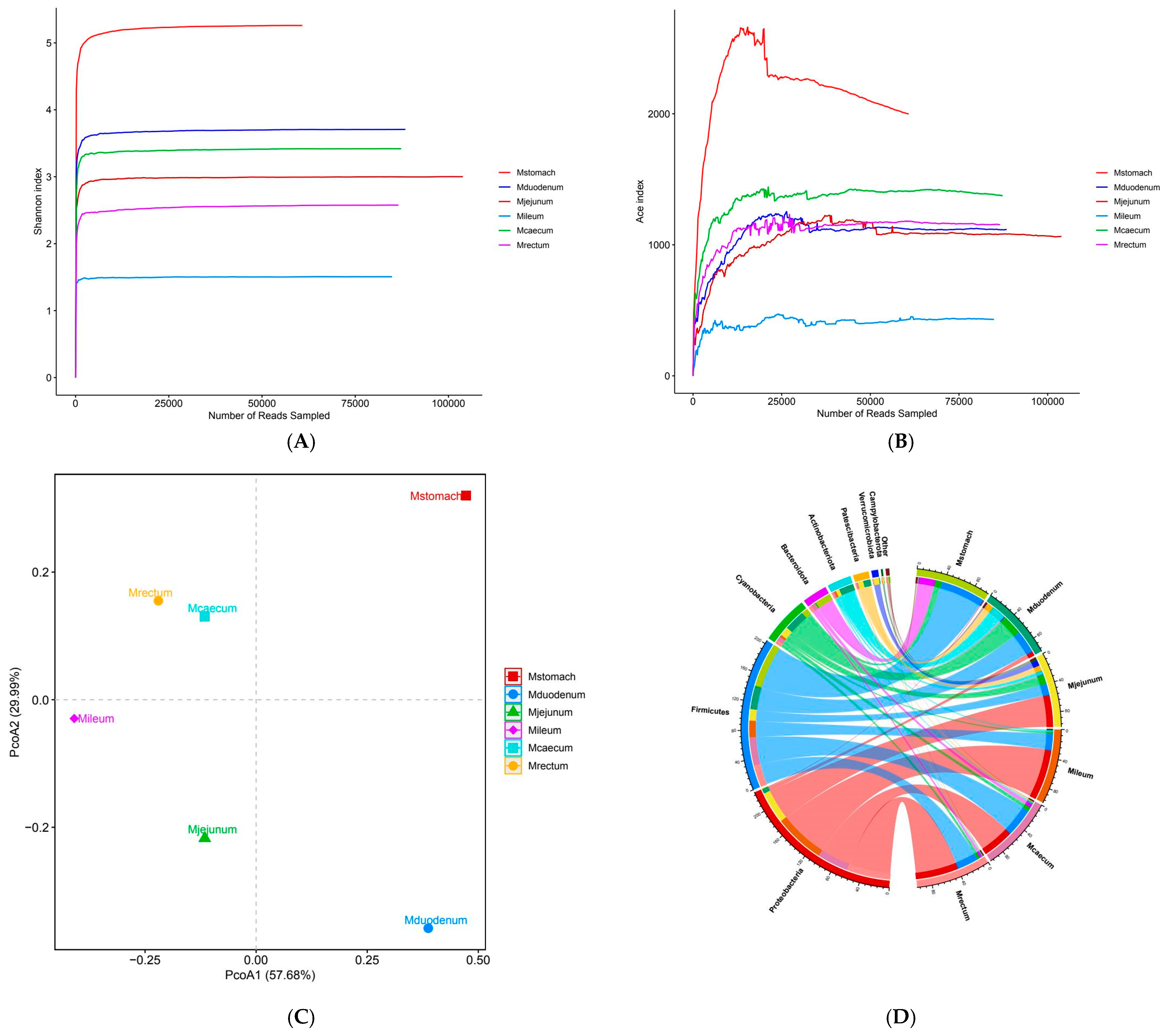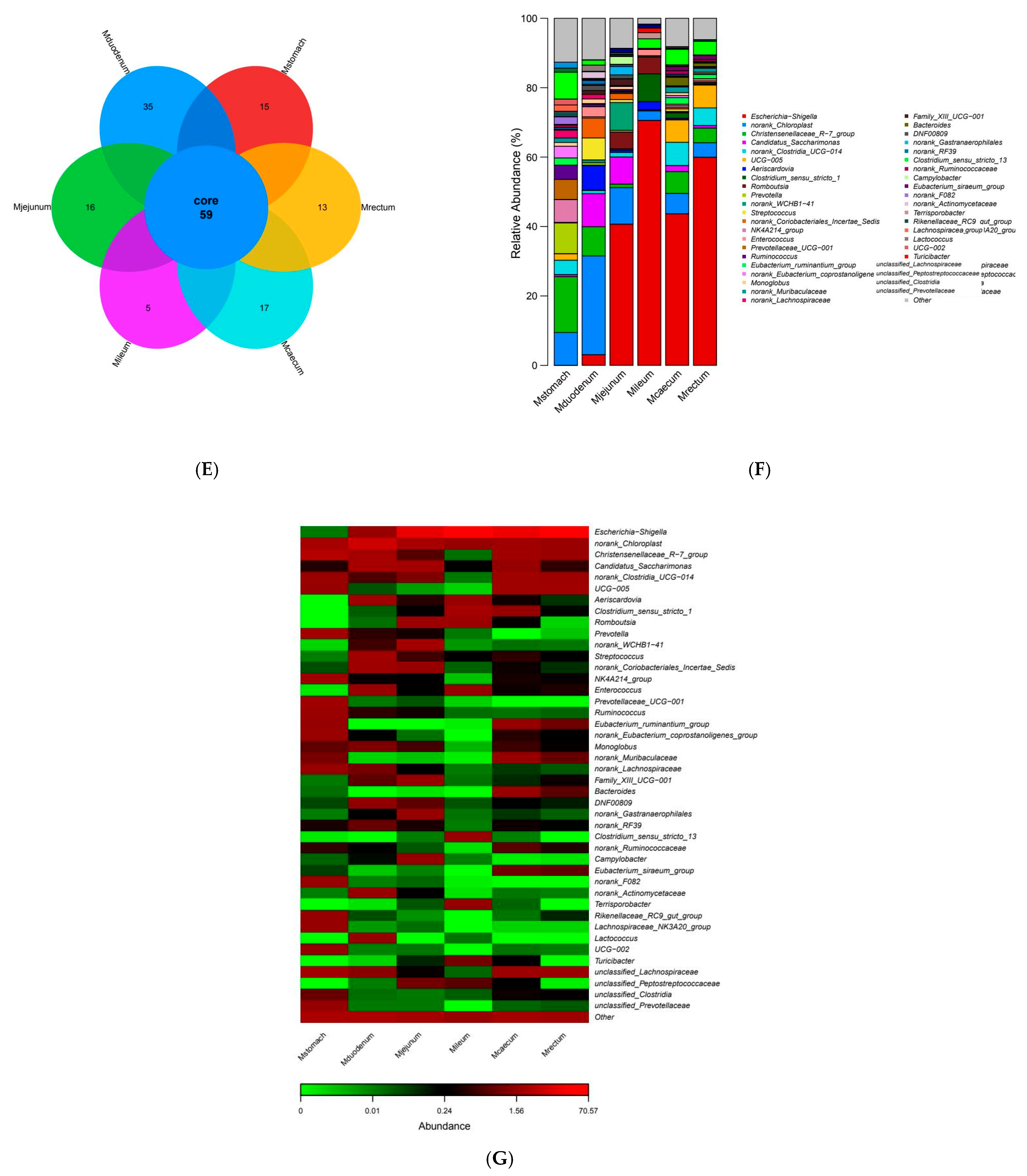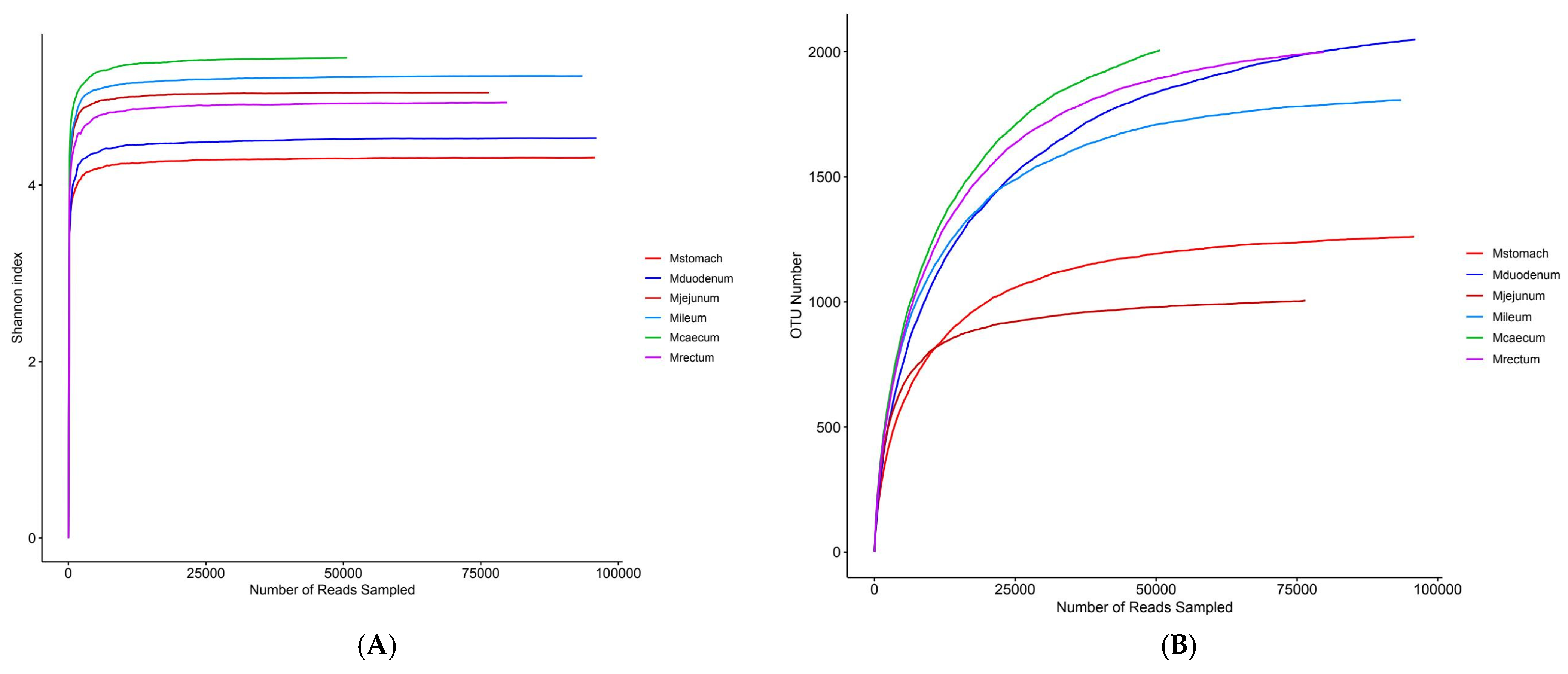 - Liu, Y.; Shu, Y.; Huang, Y.; Wen, J.; Li, Z.; Wu, Y.; Wang, H.; Zhang, C. Microbial Biogeography along the Gastrointestinal Tract of a Wild Chinese Muntjac (Muntiacus reevesi). Microorganisms 2024, 12, 1587. [Google Scholar] [CrossRef]