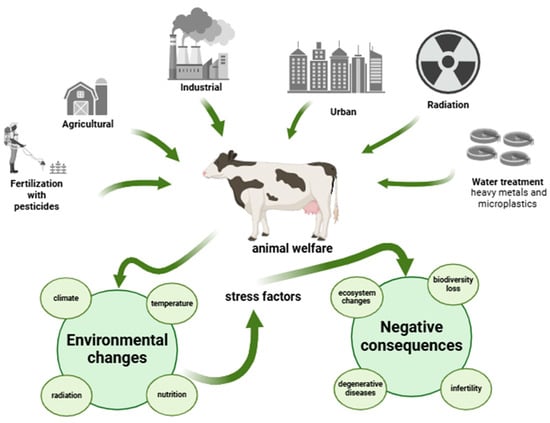 Impact of environmental stress on animal welfare and fertility, as well as on biodiversity (Created in Biorender.com).
