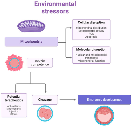 In recent years, pollution levels have increased significantly, largely as a consequence of industrialization during the 20th century. Agricultural fertilizers, manure, sewage, heavy metals, plastics, chemicals and industrial discharge are polluting coastal regions, oceans and continental ecosystems. Today, many of these compounds are found in the air, drinking water, soil, food, plants, animals and humans [1,2,3,4]. Poor air quality has become a global problem that is not limited to industrialized cities. All of these changes and exposure to other specific environmental factors, such as temperature, climate, radiation and nutrition, create an environment with increasing stress factors (Figure 1). These factors have a serious impact on the adaptation, reproduction and survival of living organisms by changing the ecosystem and biodiversity, with negative consequences, namely the increase of degenerative diseases and the decrease of fertility [5,6,7]. Several studies have linked the decline in fertility to mitochondrial dysfunction and increased reactive oxygen species (ROS) generated in mitochondria by various stressors [5,8]. In addition, environmental pollution has been shown to impair fertility in all mammalian species [2,9]. Many of these toxic compounds are endocrine disruptors or have endocrine active substances that can damage reproductive performance, which has important social and economic consequences [3,4,8,10].