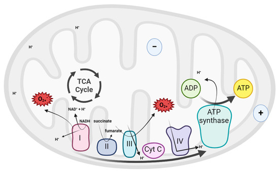 Mitochondria use the energy released by the oxidation of glucose and other sugars to synthesize adenosine triphosphate (ATP) from adenosine diphosphate (ADP). Electrons from nicotinamide adenine dinucleotide (NADH) or succinate produced in the mitochondrial matrix during the Krebs cycle are transferred to molecular oxygen by a series of protein complexes in the mitochondrial inner membrane (or in the cristae membranes), creating a transmembrane electrochemical gradient, which is used by the ATP synthase to produce ATP from ADP and inorganic phosphate [71]. This process is called OXPHOS and occurs under aerobic conditions. In addition to energy conversion, this process gives rise to the generation of ROS as by-products of electron transport chain (ETC) activity [72].