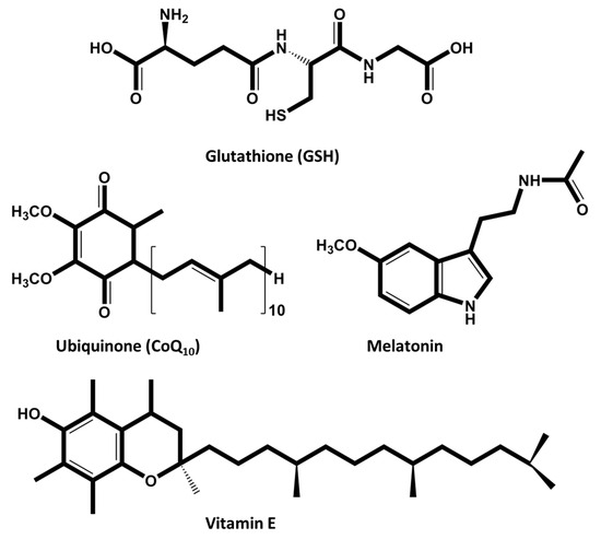 Chemical structures of endogenous antioxidants evaluated in an ART context. Glutathione (GSH), ubiquinone (CoQ10), melatonin, and vitamin E have been tested in bovine germplasm to improve fertility.