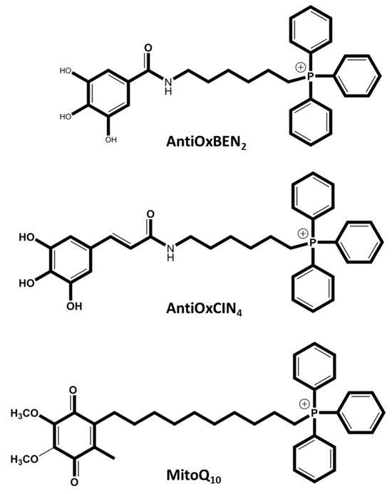Mitoquinone (MitoQ) is one of the most widely studied mitochondriotropic antioxidants. MitoQ has shown encouraging pre-clinical results in numerous studies on isolated mitochondria, cells and tissues subjected to oxidative stress and death by apoptosis, as it can reproduce the role of the endogenous mitochondrial antioxidant CoQ10. This coenzyme is covalently linked to a triphenylphosphonium cation (TPP) by a 10-carbon alkyl chain (dTPP), a lipophilic spacer (Figure 6) that allows the molecule to cross mitochondrial membranes and considerably increases its antioxidant capacity. This antioxidant represents the first clinical attempt to deliver an antioxidant to the mitochondria. The results of clinical trials with MitoQ were very important for understanding the relevance of a mitochondria-oriented approach [101,102].