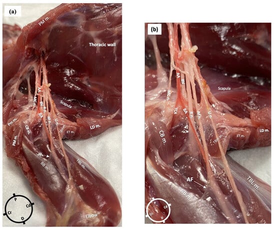 Gross anatomical dissection of the right axillary area of a rabbit in dorsal recumbency. The skin, the pectoralis muscles and the latissimus dorsi muscle were carefully removed to reveal the axillary area, which following careful dissection allowed the identification of the radial, ulnar, median and musculocutaneous nerves (axillary fascia was removed, but a small portion is still visible). (a) AA: axillary artery; BA: brachial artery; BV: brachial vein; R n: radial nerve; U n: ulnar nerve; MC n: musculocutaneous nerve; M n: median nerve; PM m: pectoralis major muscle; CB m: clavobrachialis muscle; LD m: latissimus dorsi muscle; AF: axillary fascia; BB m: biceps brachii muscles; TBL m: triceps brachii long head muscle; TM m: teres major muscle. (b) Magnified picture of Figure 1a to show the neurovascular bundle in more detail.