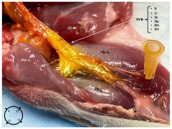Anatomical dissection of the right thoracic limb of a rabbit, medial view, after an ultrasound-guided proximal radial, ulnar, median and musculocutaneous (RUMM) nerve block technique was performed using 0.1 mL kg−1 of yellow tissue dye solution with lidocaine 2% mixed in a 1:3 v:v ratio. The injectate is localised only within the axillary fascia staining the neurovascular structures (R, radial nerve; U, ulnar nerve; M, median nerve; Mc, musculocutaneous nerve; BA, brachial artery; BV, brachial vein). NVB, neurovascular bundle; BB m, biceps brachii muscle; PM m, pectoralis major muscle; LD m, latissimus dorsi muscle; TBL m, triceps brachii long head muscle.