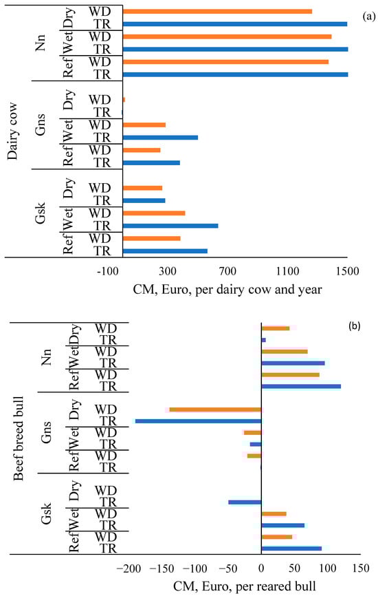 In this study, CM for all 54 combinations of grasses (TR, WD), animals (dairy cow, beef bull, beef cow), regions (Gsk, Gns, Nn), and scenarios (Ref, Wet, Dry) were computed. The calculations were made for herds with 100 dairy cows, 50 beef bulls slaughtered per year, and 50 beef cows, due to typical average Swedish herd sizes. Average prices for the years 2019–2023 were used in the calculations hence reflecting averages prices over a longer time [29,30].