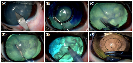 Cataract surgery was performed using the PHACO (BAUSCH + LOMB, Stellaris EliteTM, St. Louis, MO, USA) method. A 2.8 mm corneal incision was made 2 mm away from the corneal limbus (Figure 1A). Before performing capsulorhexis, a viscoelastic agent (Kukje Hyaluronate-I inj., 0.85 mL/dog, Kukje, Pharm., Seoul, Republic of Korea) was injected into the intracamera to maintain the shape of the anterior chamber for the capsulorhexis and to protect the corneal endothelium. Trypan blue was utilized as an adjunct agent to enhance visualization of the anterior capsule during PHACO of mature white cataracts (Figure 1B). An incision was made in a round shape with a diameter of 5 mm in the center of the lens anterior capsule (Figure 1C). Then, the lens was separated by hydrodissection with a BSS solution (Alcon BSSTM, Fort Worth, TX, USA) (Figure 1D). The residues of the lens nucleus and lens cortex were aspirated by PHACO, and the lens was polished clean (Figure 1E). Intraocular lenses (an-vision, MD4-12, D+41.0, West Jordan, UT, USA) matching the size of each eye were implanted into the lens capsule using an injector. The corneal incision was closed by simple interrupted sutures with 10-0 black nylon (REXLON-black nylon USP10-0, spatula 6 mm 3/8, Seoul, Republic of Korea) (Figure 1F). During the final stage of surgery, when physiological pressure in the anterior chamber was needed, a BSS solution was injected to inflate the anterior chamber. At this time, IOP was estimated by digital palpation instead of measuring by a tonometer.