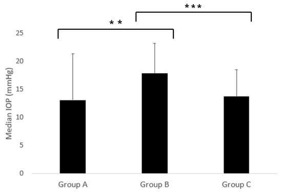 Significant differences in IOPs were observed among the groups (p < 0.001). Group B demonstrated significantly higher IOPs compared to both Group A and Group C (p < 0.01 and p < 0.001, respectively). No significant difference was observed between Group A and Group C. (Figure 2).