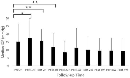 Time course of intraocular pressure (IOP) after cataract surgery using PHACO in dogs. Data are expressed as mean ± SD, p-value was acquired by paired t test. * p < 0.05, ** p < 0.01. Pre-OP: Pre-surgery, Post: Post-surgery.