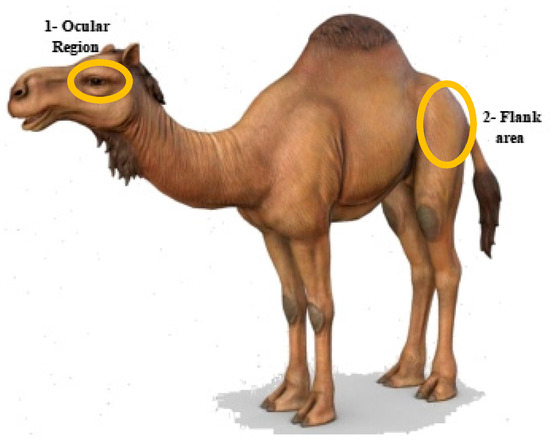 A thermographic camera (FLIR E76 24°; FLIR Systems AB, Danderyd, Sweden) was used for capturing images during this study. The camera was calibrated using the environmental temperature and relative humidity recorded by a weather station (Kestrel 4000, Wet Des Moines, IA, USA) before each use. This IR thermal camera has a thermal sensitivity of <0.05 °C at temperatures of ≥30 °C, having an automatic hot/cold temperature detection range between −20 °C and 1000 °C and a detector efficacy of 640 × 480 (307,200 pixels). This integrated color camera had a minimum focus distance of 15 cm, 5.0 megapixels, and it provided 4× the pixel data for creating a super-resolution image of 1280 × 960. The infrared camera had a laser pointer for focusing images and a laser distance meter to measure the distance to the specific body area measurement. Static thermal images for measuring the skin’s superficial temperature (°C) (SST) were taken at a 90° angle from a distance of 1 m [48]. To minimize the impact of human errors and environmental factors, thermo-graphic evaluations were consistently conducted in the field by the same operator (NTM). At least two pictures were taken for each camel; IRT images of either the left or the right side flank regions and either the left or right eye regions were captured to measure the superficial surface temperatures while the camels were either in a standing or recumbent position (Figure 1).