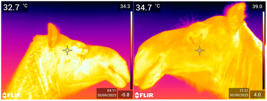 Table 1 shows the average eye temperature (ET) with standard errors for each category of the sampled camels. The average eye temperature varied slightly across the different age classes, although no statistically significant effects of the age classes were found. Sex also had no significant effect, and a similar average ET was observed between the male and female camels. Only the physiological status resulted in a significant effect, with pregnant camels showing a significantly lower average eye temperature (34.75 °C) compared to non-pregnant camels, both lactating and not lactating (35.2 °C and 35.3 °C, respectively). Figure 2 shows two examples of ET.