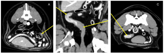 Diagnosis of ORS is performed by the identification of steroid hormones in the blood circulation after neutering or by the localization of a part or all of the ovary in the abdominal cavity. These procedures can be performed by exploratory laparotomy/laparoscopy [2,3,6,8,9], ultrasonography [10], and advanced imaging techniques [11]. In veterinary medicine, as showed in this case, abdominal ultrasound might not be sufficient for identifying adnexal structures due to their size, while computed tomography (CT) improves visualization and identification of ovarian tissue and helps avoid continuous exploration or subsequent surgical errors [12].