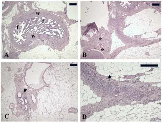 Micrographs from sections of residual oviduct and ovary fragments. (A) Oviduct showing extensive fibrosis affecting the wall (w) and the mucosal folds (f). (B) Ovary tissue showing cystic follicles (asterisks). (C) Ovary tissue showing few primordial follicles (arrowhead) in the cortical region. (D) Ovarian parenchyma showing loss of normal physiological architecture due to degenerative processes and few primordial follicles (arrowhead). Hematoxylin-eosin staining. Magnification bars = 100 µm.