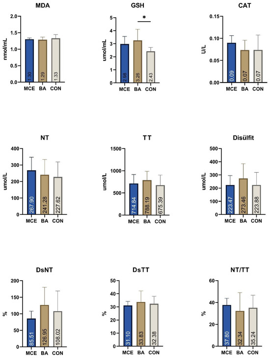 Considering the GSH parameter, a significant increase was seen in the BA group compared to the CON group. No statistically significant difference was detected in MDA, CAT, NT, TT, disulfide, DsNT, DsTT, and NT/TT data (Figure 1).