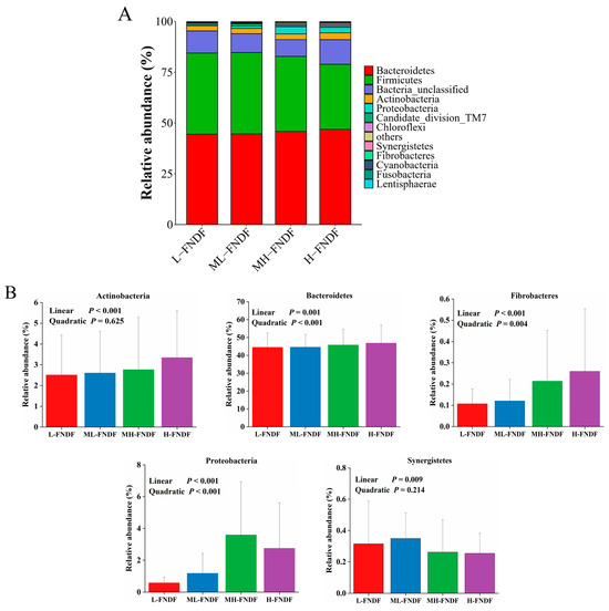 The predominant phyla present in the rumen ecosystem were identified as Bacteroidetes and Firmicutes (Figure 1A). As shown in Figure 1B, increasing the dietary FNDF content resulted in a quadratic response in the relative abundance of Bacteroidetes (p < 0.001), Fibrobacteres (p = 0.004), and Proteobacteria (p < 0.001). Additionally, the relative abundance of Actinobacteria (p < 0.001), Bacteroidetes (p = 0.001), Fibrobacteres (p < 0.001), and Proteobacteria (p < 0.001) in the rumen increased linearly with increasing dietary FNDF content, while the relative abundance of Synergistetes decreased linearly (p = 0.009).
