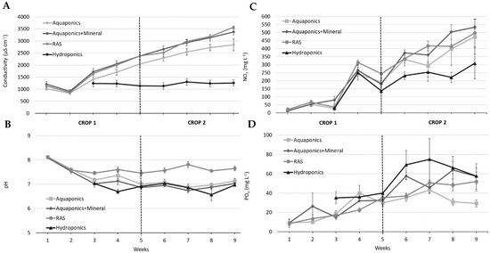 In terms of water quality fluctuations (Figure 2), electrical conductivity was stable in hydroponics and increased over time in both aquaponics treatments and RAS. pH trends over time were relatively similar. However, hydroponics treatment presented continuous levels of <6, compared to >7 in RAS and both aquaponics. Sodium concentrations also increased over time in the RAS, aquaponics and aquaponics + minerals treatments and were higher than in the hydroponics treatment. Although in different magnitudes, nitrate and orthophosphate increased over time in all treatments.