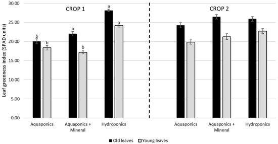 Mean (± standard error) of leaf greenness (SPAD) in young and old leaves in aquaponics, aquaponics with mineral supplementation and hydroponics (plant control). Crop one lasted 24 days and crop two lasted 27 days. Capital letters indicate differences in leaf age and lowercase letters indicate differences in production technique (two-way ANOVA, p < 0.05). No interaction was detected (p > 0.05).