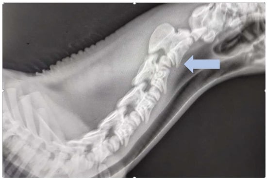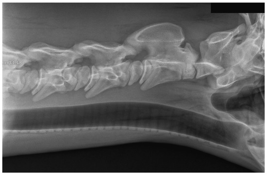 Neck tenderness was slightly increased on both sides; on the right side at the C2/C3 level, painful enlargement of soft tissues was palpable. Based on the examination results, a decision was made to administer anti-inflammatory and analgesic treatment. Meloxicam (Rheumocam 15 mg/mL, Chanelle Pharmaceuticals Manufacturing Ltd., Galway, Republic of Ireland) was administered orally at a dose of 0.6 mg/kg b.w. for 14 days, and dimethyl sulfoxide (DMSO) was administered intravenously three times every 48 h at 1 g/kg b.w.