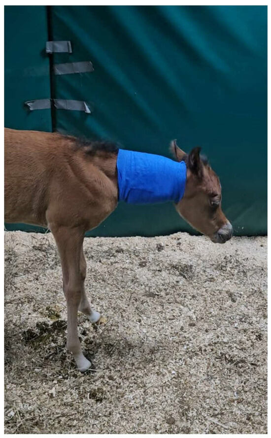 Photos taken 4 days after the injury—the foal presented a posture with a stiff and characteristically hyperextended neck as well as clinical signs of ataxia.