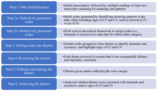 Data analysis followed Braun and Clarke’s [30] six-step thematic analysis. As this study employed a theoretical framework to explore demands and resources using the JD-R, yet also was exploratory in nature due to the intention to explore signs of CF and CS in the sample, both inductive data-driven analysis and deductive theory-driven analyses were performed, as discussed by Braun and Clarke [31]. This involved familiarization with the data, assigning key data pieces with a code, sorting the coded data into themes, reviewing the themes for consistency and validity, defining and naming the themes, and analyzing the themes. The steps involved in the context of this study are depicted in Figure 1.