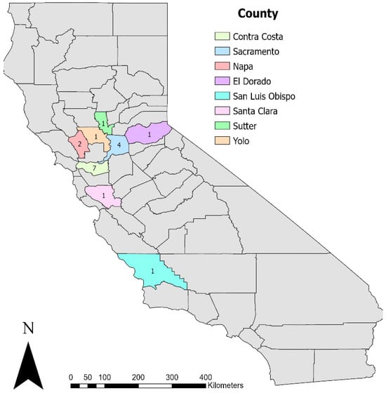Geographic distribution at the county level of the studied beavers in California. The number of animals is shown within each county.