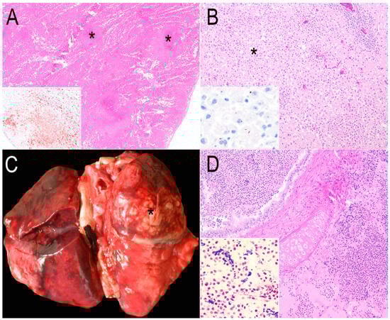 Pathology of the other causes of death besides baylisascariasis or Baylisascaris spp.-suspected encephalitis in beavers from California. (A) Random lytic necrosis in the hepatic parenchyma (asterisks) caused by Francisella tularensis. Hematoxylin and eosin (H&E). Inset: Positive immunolabeling for F. tularensis by immunohistochemistry in a necrotic focus. Immunohistochemistry (IHC) for F. tularensis. (B) A focally extensive area of histiocytic and neutrophilic infiltration (asterisk) and severe perivascular cuffing (upper right). H&E. Inset: Positive immunolabeling for intracellular rod-shaped bacteria compatible with Listeria monocytogenes. IHC for L. monocytogenes. (C) Dorsal view of the lungs with severe bilateral bronchopneumonia with evident purulent exudate in the right cranial lobe (asterisk). (D) Photomicrograph of Figure 3C, numerous neutrophils and necrotic debris are within the bronchus and alveoli. H&E. Inset: Numerous Gram-positive cocci among the cellular exudate. Gram staining.