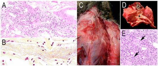 Pathology of the other causes of death besides baylisascariasis or Baylisascaris spp.-suspected encephalitis in beavers from California. (A) The leptomeninges are markedly expanded by neutrophils and fibrin. H&E. (B) Numerous Gram-negative coccobacilli corresponding to Acinetobacter towneri are embedded in fibrin strands. Gram staining. (C) Ventral view of the thorax, the pectoral muscles are interlaced with tan–white, opaque tissue corresponding to a chronic active inflammation. (D) Cross-section of the pectoral muscles with evident necrotic exudate in the fascia (asterisk). (E) Photomicrograph of Figure 4D with coccobacilli bacterial colonies (arrows) surrounded by fibrin and neutrophils among the adipocytes. H&E.