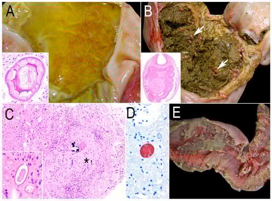 Other comorbidities in free-ranging beavers from California. (A) Stomach containing abundant straw-like color, watery fluid with numerous filiform, brown nematodes Travassosius sp. Inset: Cross-section of the nematode’s cuticular ridges, platymyarian muscles, lateral cords, and a pseudocoelom with the intestinal characteristics of a trichostrongyle. H&E. (B) The cecum of a beaver with roughage digesta and numerous trematodes (white arrows) Stichorchis sp. Inset: A coronal section of this trematode with oral and ventral suckers and bilateral ceca. H&E. (C) A focal granuloma with minimal mineralization (asterisk) surrounded by numerous nematode eggs compatible with a capillarid species. H&E. Inset: The nematode egg is embryonated and has a thick shell and bipolar plugs. H&E. (D) Immunolabeling of a Toxoplasma gondii cyst in the brain containing numerous zoites. IHC for T. gondii. (E) Colon of a beaver with diphtheritic membranes attached to the hyperemic mucosa.