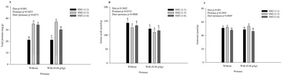 In general, the SM3 group had higher concentrations of AAs, total proteins, and globulin compared to the SM1 group (Table 5). The SM2 group with protease supplementation showed a higher concentration of albumin and globulin compared to the SM1 group with protease, but did not differ from the SM3 group with the enzyme.