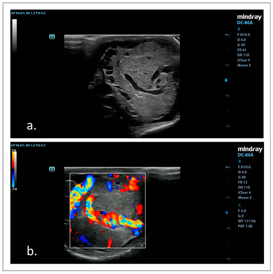 Ultrasound image of a canine testis affected by a Leydig cell tumor, with B–mode (a) and color Doppler ultrasound (b).