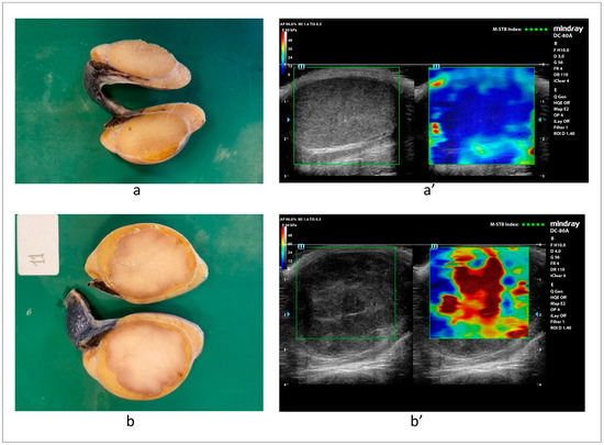 Gross anatomy (a,b) and 2D-SWE (a’,b’) appearance of a pair of testes, one being healthy (a,a’) and one affected by diffuse seminoma (b,b’).